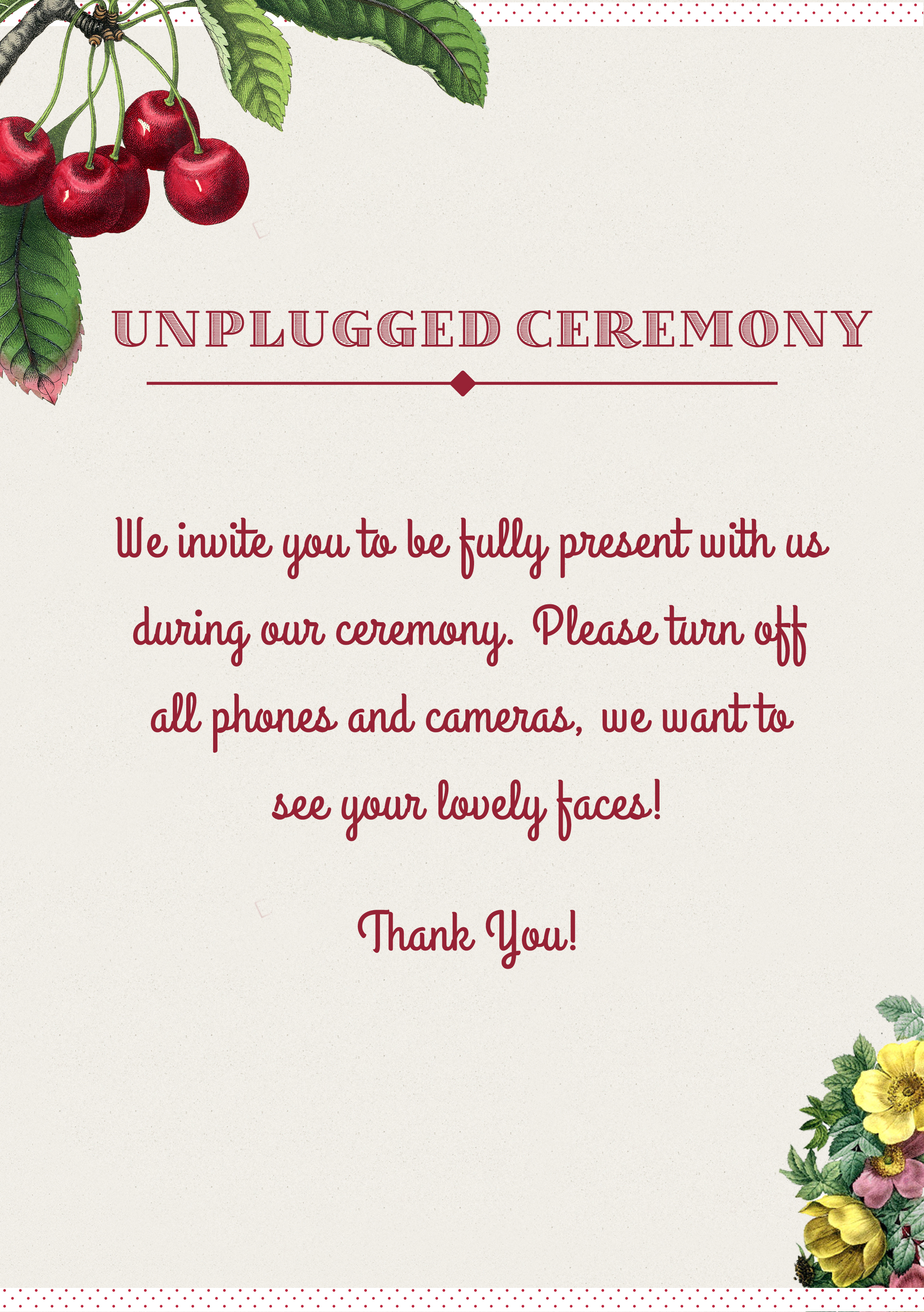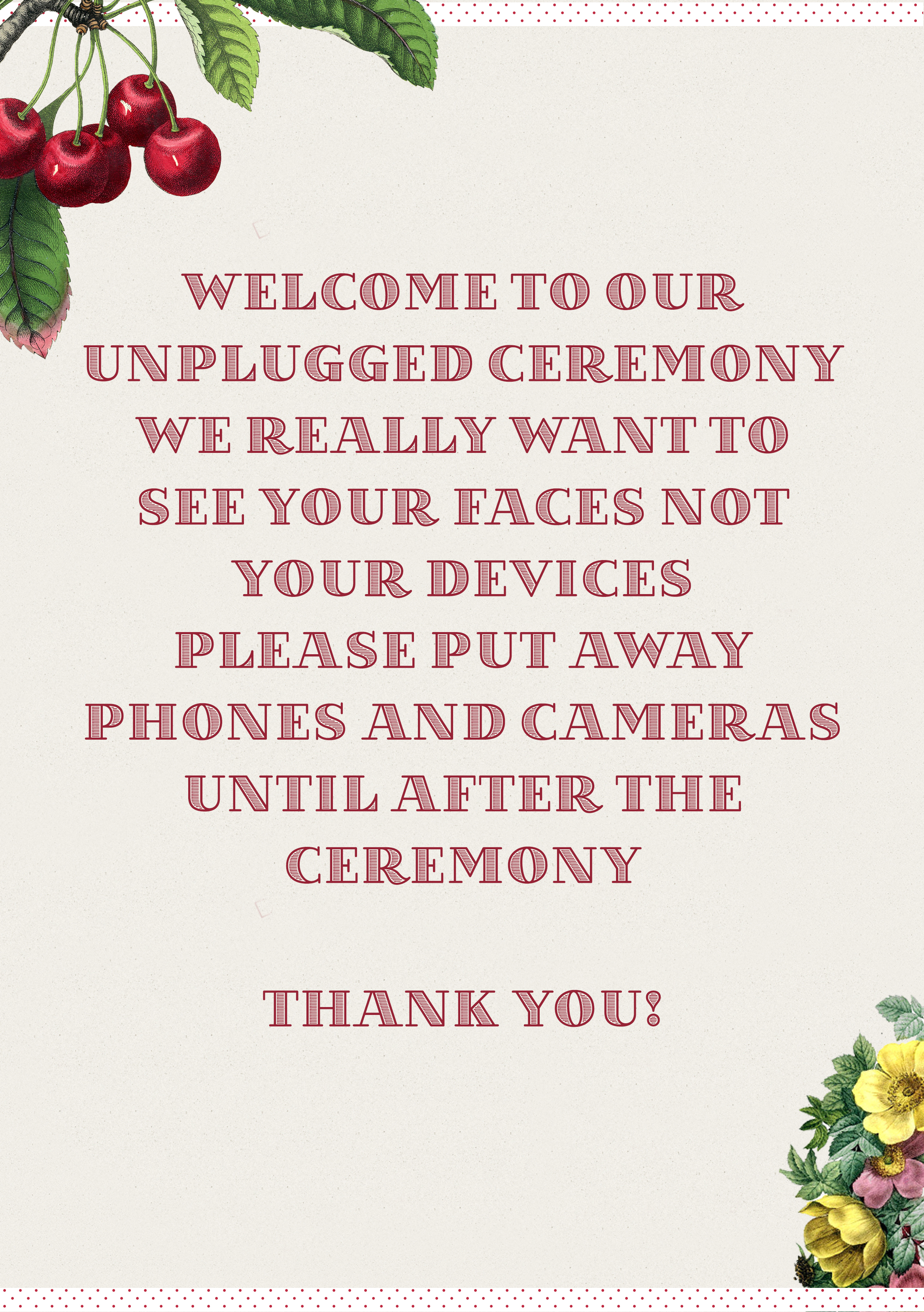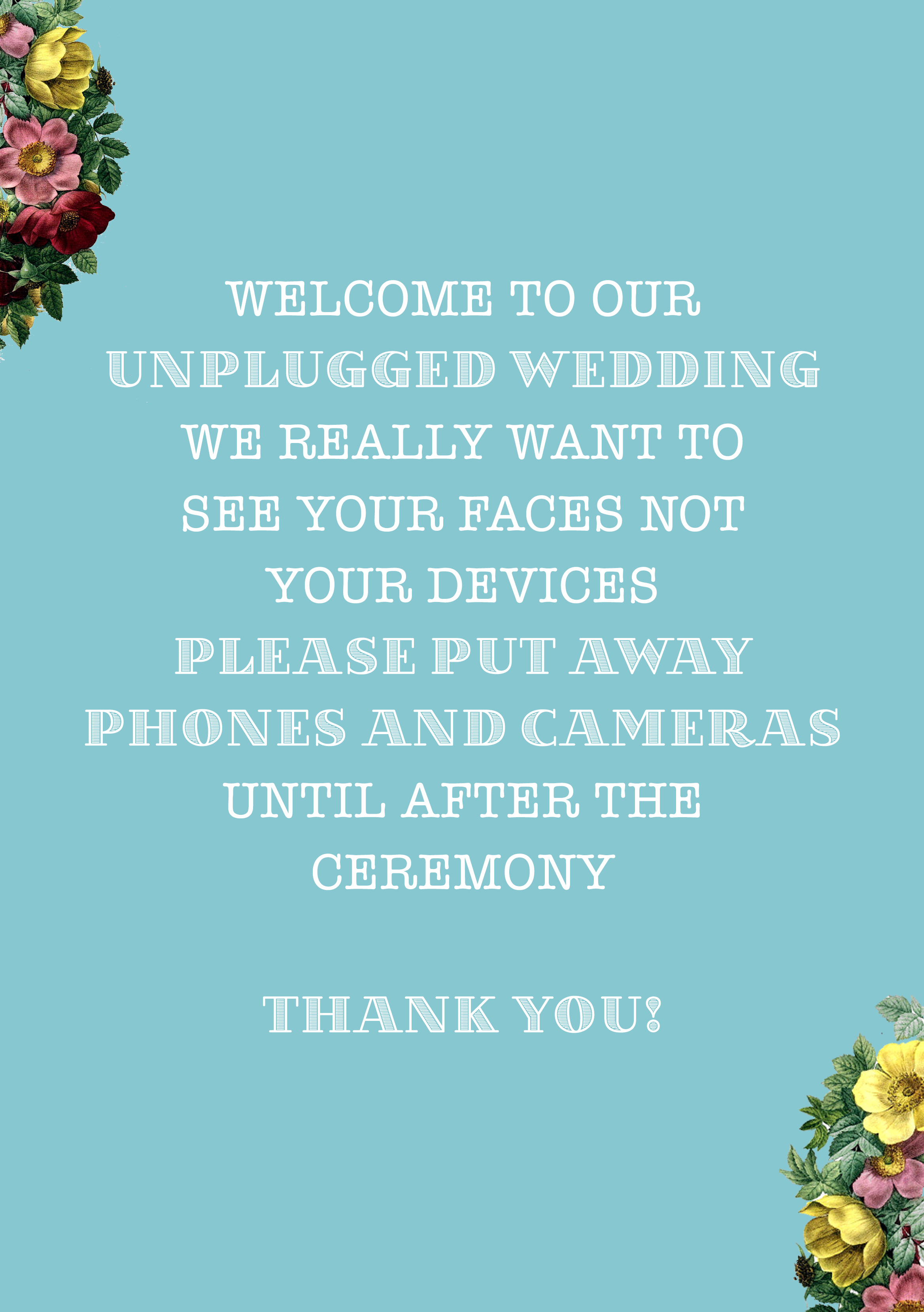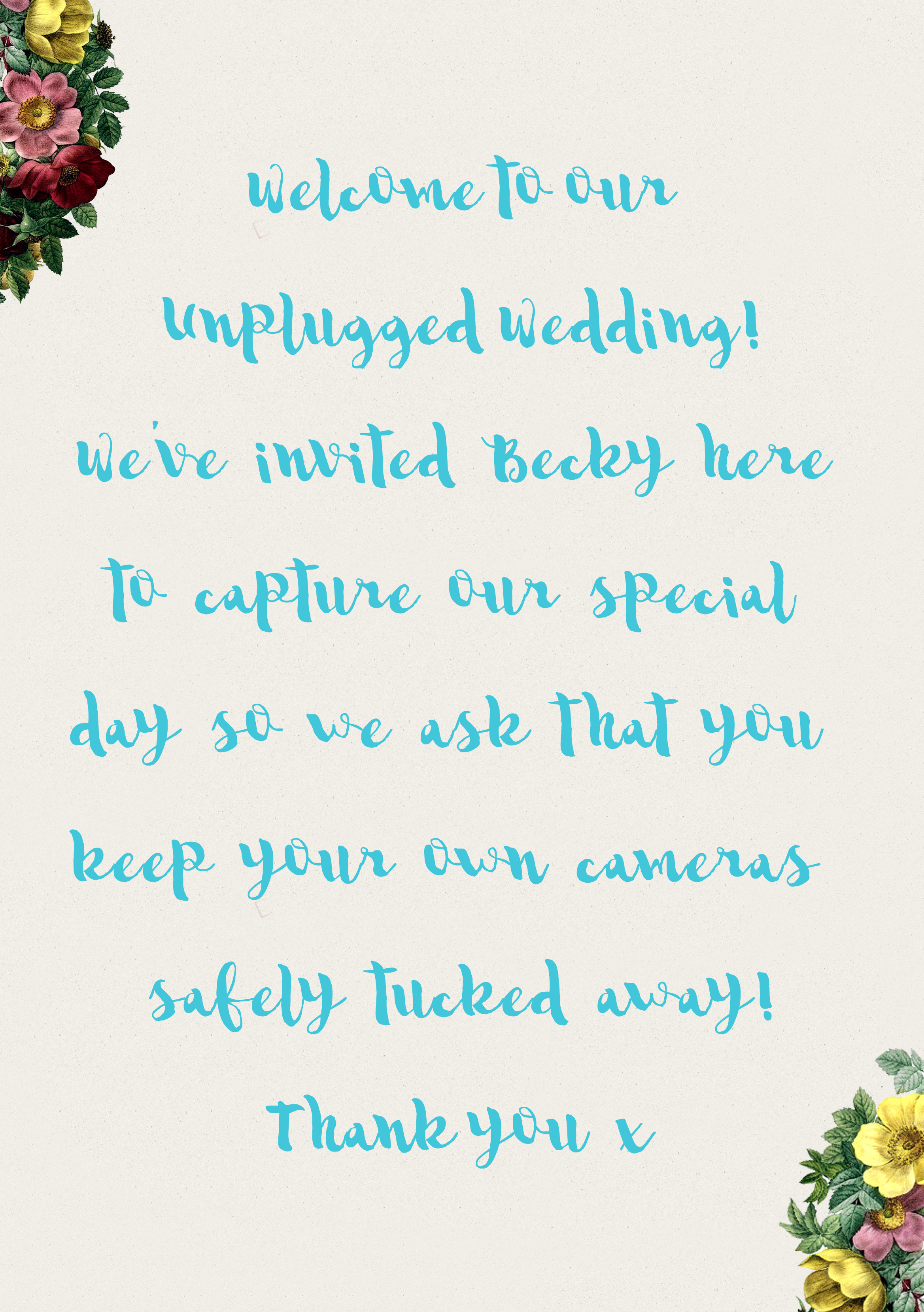 Rachel and Aaron created these wonderful signs for their wedding ceremony. Not only does having an unplugged ceremony make things easier for your photographer, it also gives your guests no excuse not to completely be at the ceremony, not hiding behind any technology. As a couple I’m sure all brides and grooms want to be able to look out and see the smiling faces of their loves ones rather than a sea of phones and cameras, so I love the idea of unplugged ceremonies.