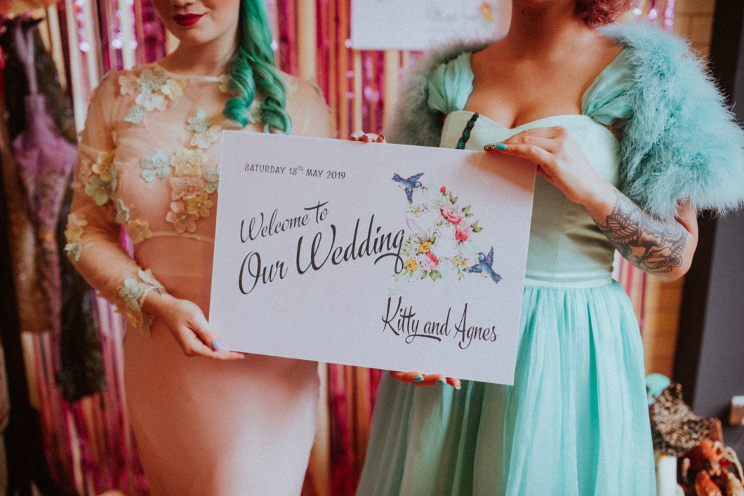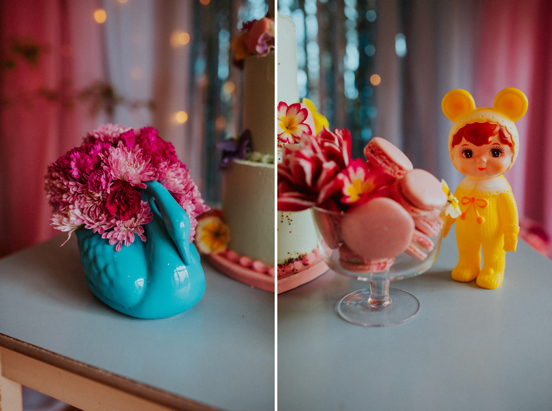 A large part of bringing the vision to a reality was done with the help of Julia from Curious Magpie (previously of Orange Tree Weddings) who really brought the retro kitsch to the shoot with their wonderful styling and great array of props. Our brides quirky and colourful dresses were created from scratch (featuring some sequin applique loveliness) from local dress makers Bella Figura based in Matlock. The whole team were wonderful and really helped everything come together! Do check out everyone’s links at the end of this post for everyone that was involved. All the ladies are real wedding suppliers so if you fancy bringing some quirky retro kitsch to your own wedding day they could certainly help!